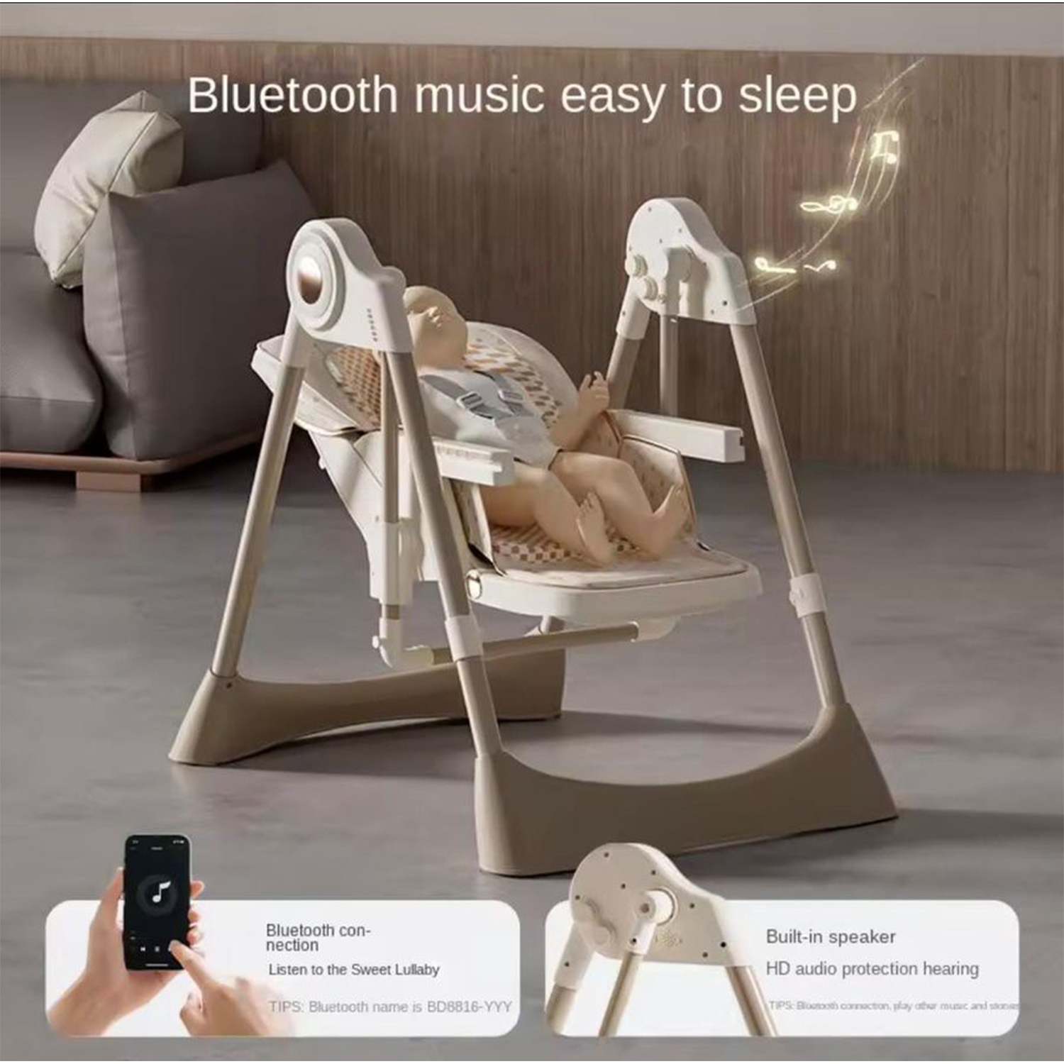 This high-tech chair includes smart features such as a Type-C interface, Bluetooth connectivity, and a touch screen interface on the main body. It is designed with a luxurious, easy-to-clean faux leather pad and a five-point safety harness to ensure maximum comfort and safety for the baby .